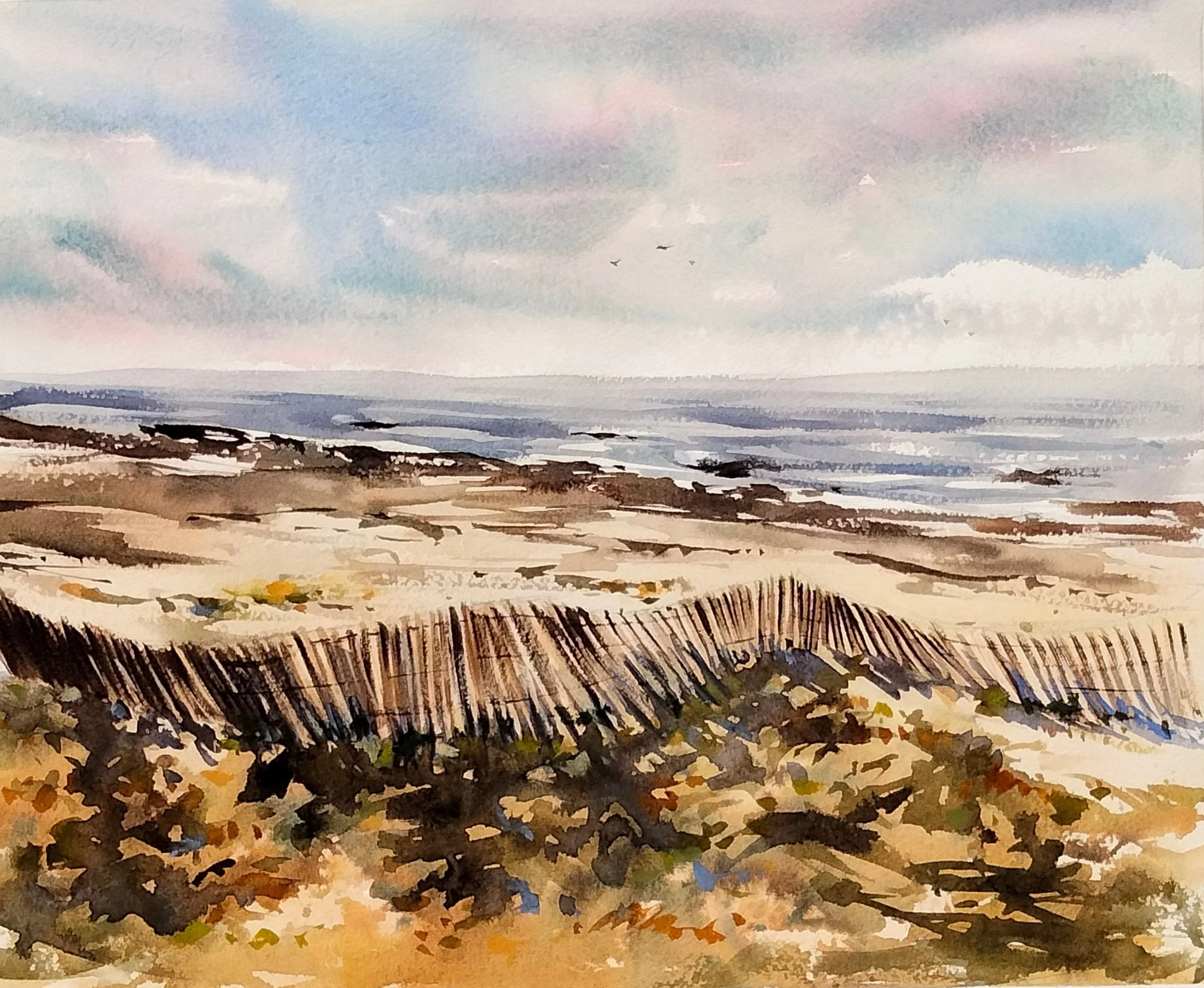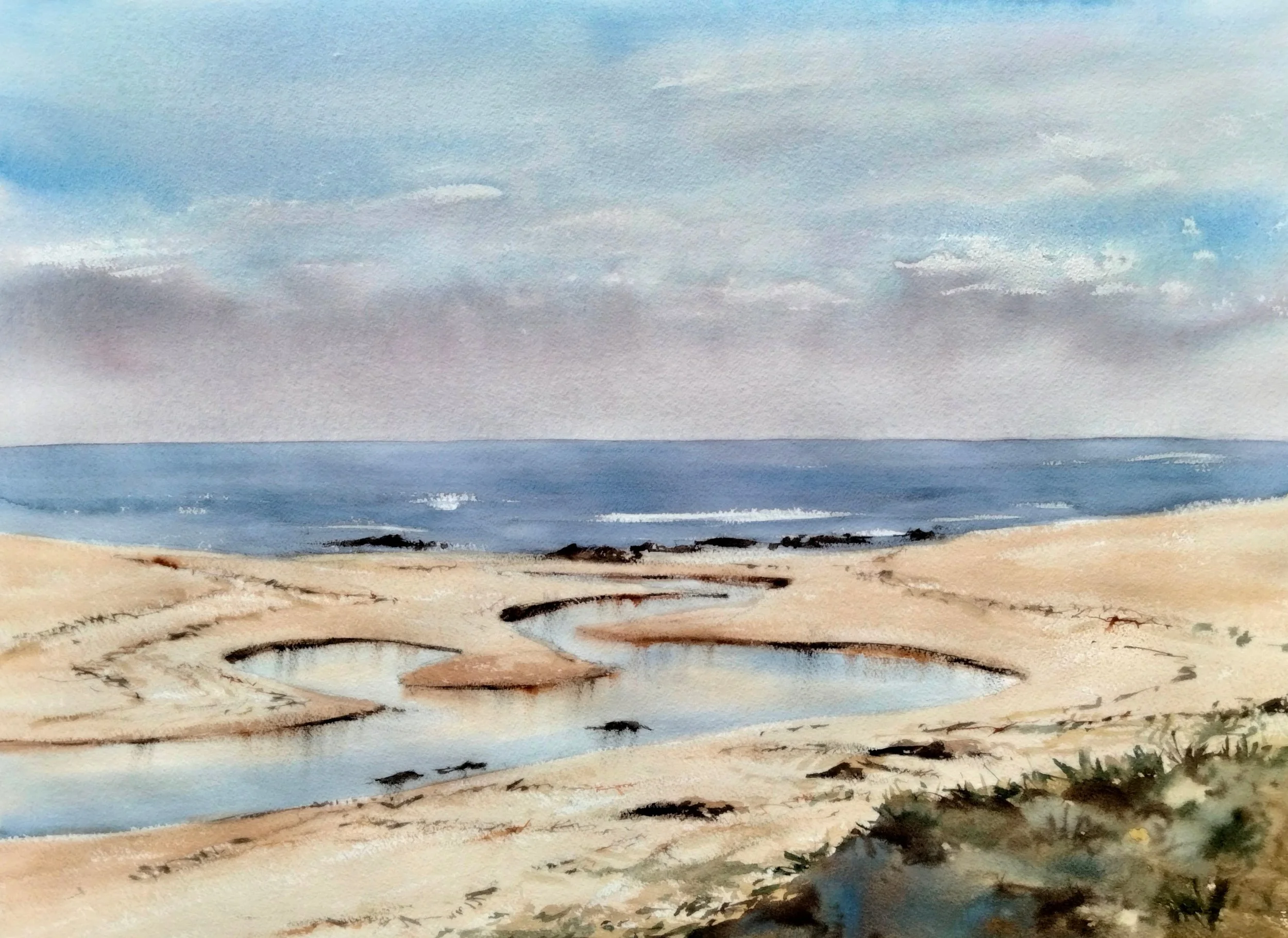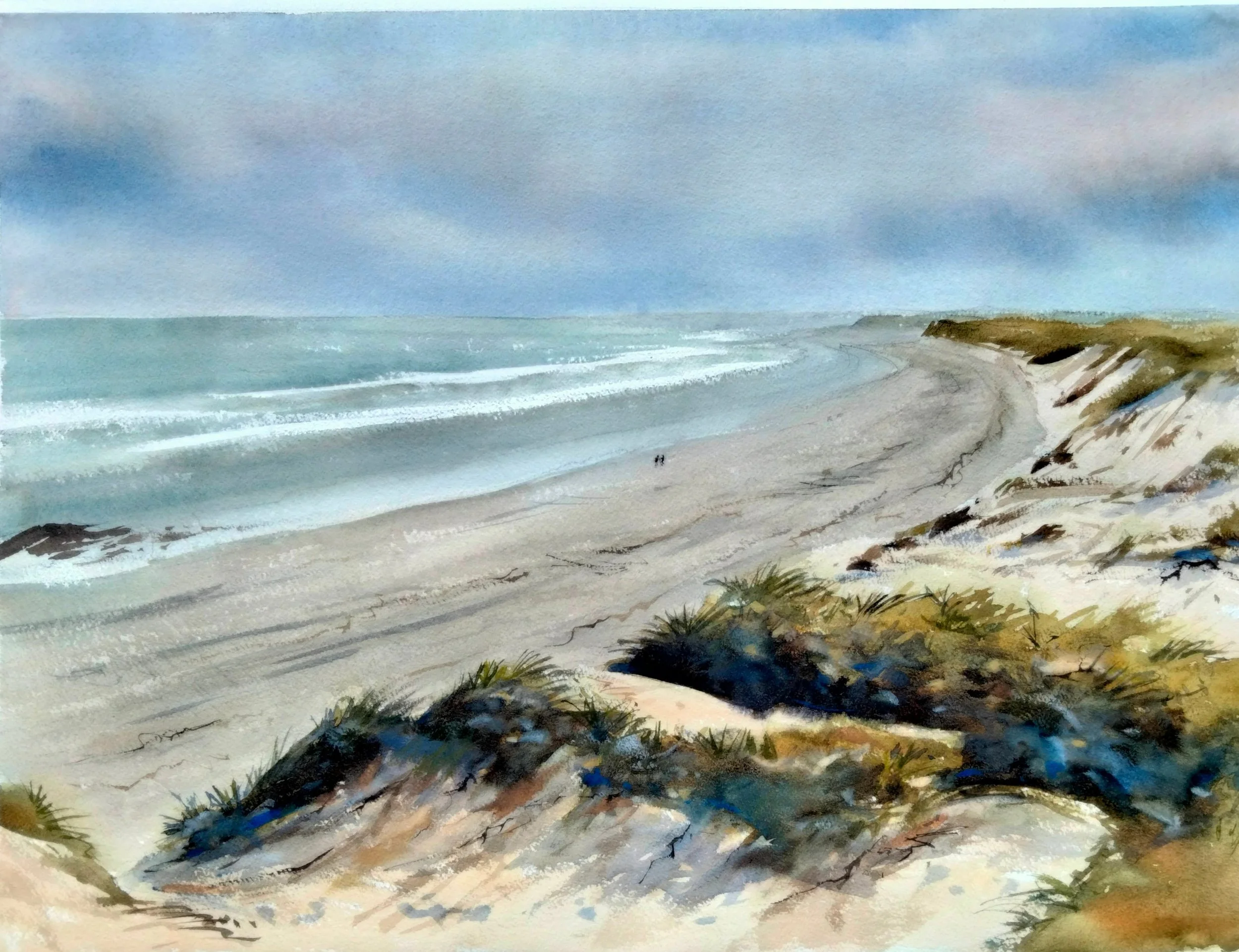 The dunes are immense along this stretch of the Senda Littoral, between Vila do Conde and Esposende. I’m walking alone and wondering if those down below walking on the sand are peregrinos or local people out for some exercise. I feel invigorated and alive being this close to the sea amongst the dunes. 370 x 270.