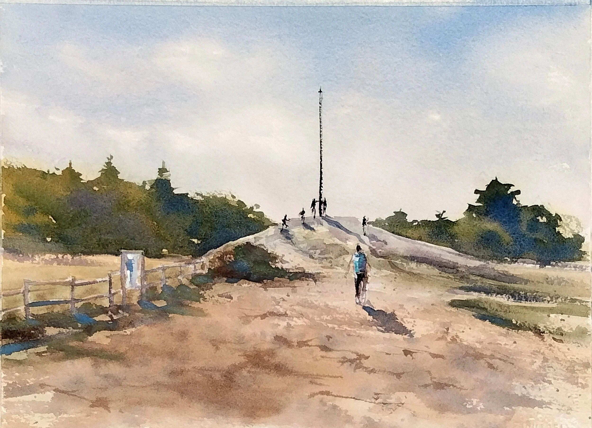 Don’t underestimate the climb up to the top at Col Lepoeder. It’s uphill all the way. With all my painting gear and some things that were simply unnecessary, I had too much in the pack. I was very happy to finish with the uphill walking by now, and relieved it was all downhill to Roncesvalles. I did this one back in the studio at home from a reference a fellow peregrino photographed at the time. 410 x 310.