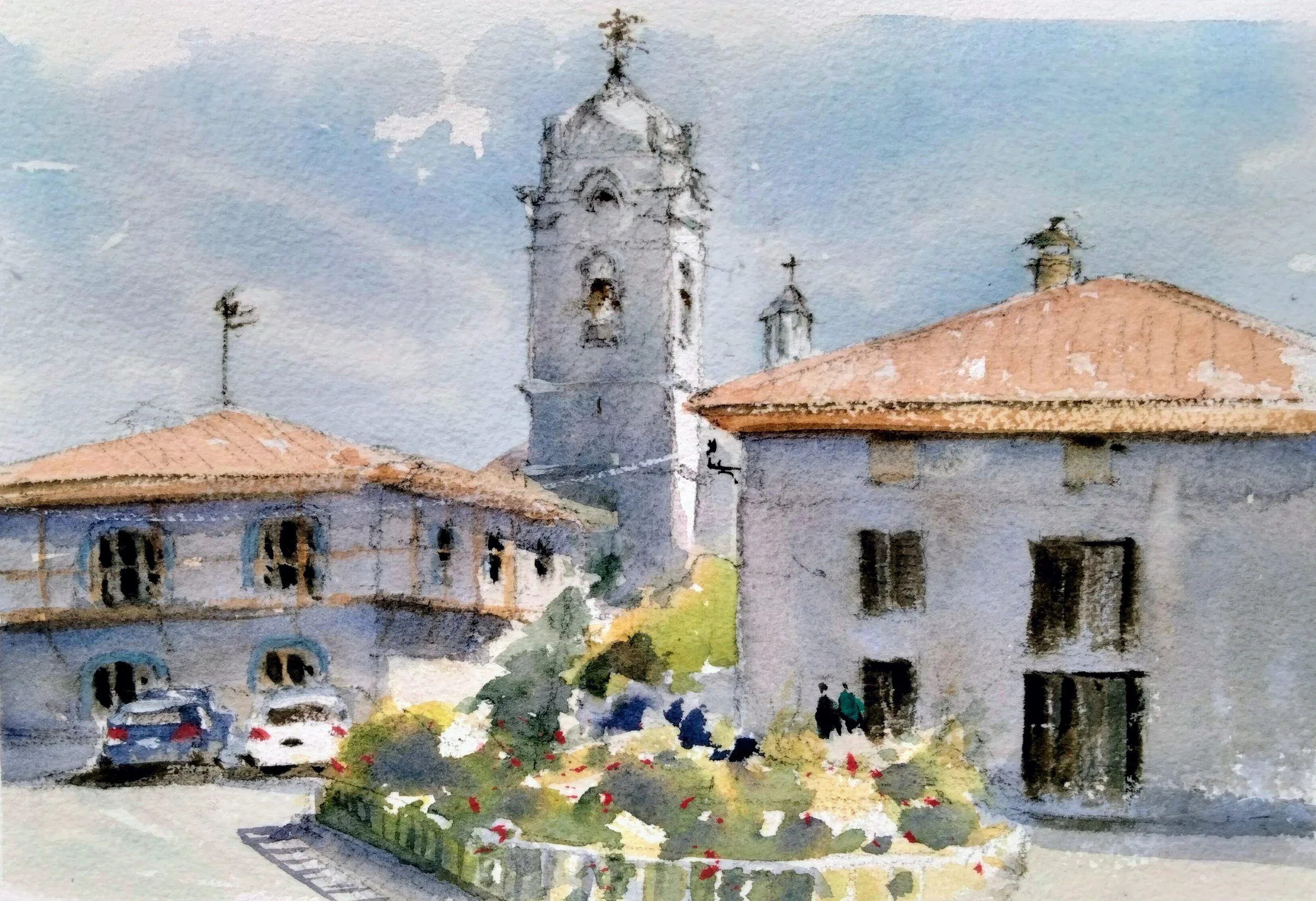 The front entrance to the albergue in Rabe de las Calzadas faces this plaza, and a trestle table by the door provides the perfect spot from which to paint this scene. The bells in the church tower chimed whilst I painted, and the village slumbered through its siesta. 310 x 230.